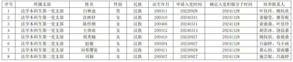 根据本人申请、组织培养,经群团组织推优、党支部委员会研究,拟吸收白林迪等8名同志为入党积极分子,现将有关情况予以公示。