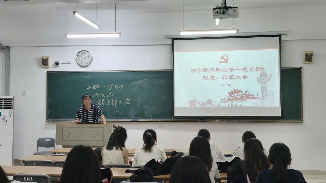为持续强化基层党组织建设,吸纳优秀人才充实党员队伍,2025年6月16日13:30,法学院本科生第一党支部党员吸收转正大会在4-309教室召开,法学院本科生第二党支部党员吸收转正大会则在4-311教室同步进行。
