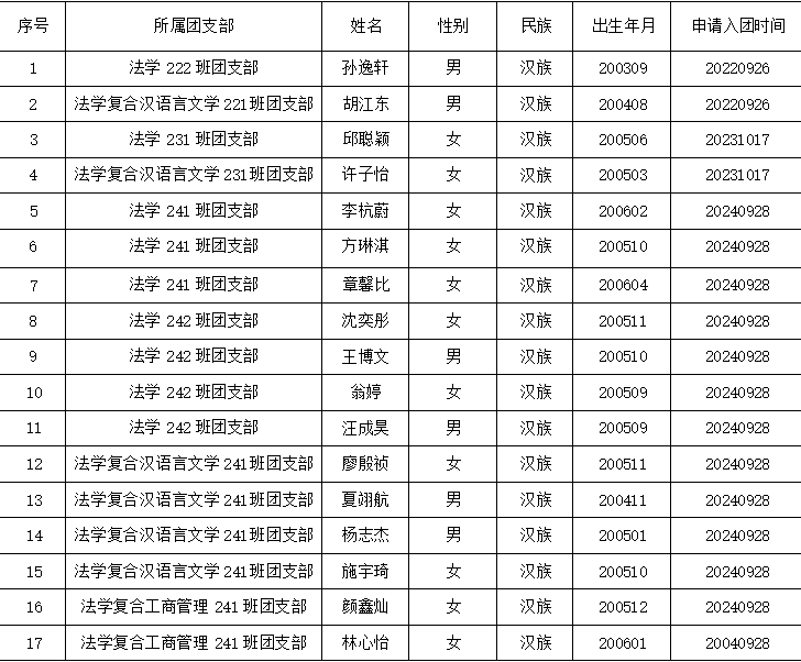 根据支部推荐、资格审查、法学院团总支讨论,拟吸收孙逸轩等17 名同志作为 2024-2025 学年第二学期团员 发展推荐人员,现将有关情况予以公示。