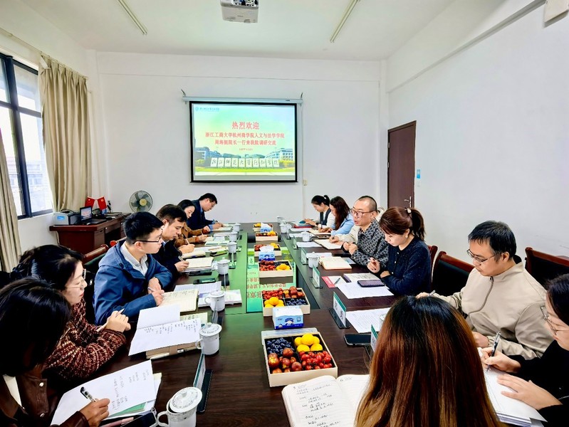 段知壮院长对周海挺院长一行的到来表示热烈欢迎,并介绍了学院总体办学情况。周海挺院长也就浙江工商大学杭州商学院人文与法学学院的整体状况进行了介绍。双方围绕专业建设、人才培养、招生就业、学科竞赛、社会服务、党建活动、教师发展等方面工作进行了深入地交流。